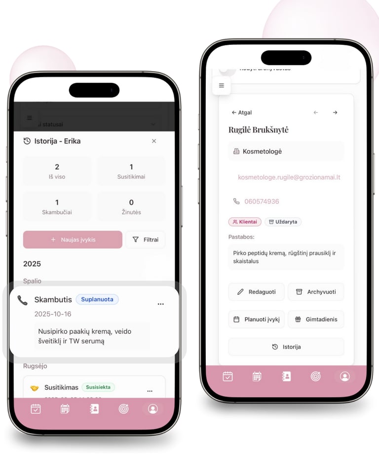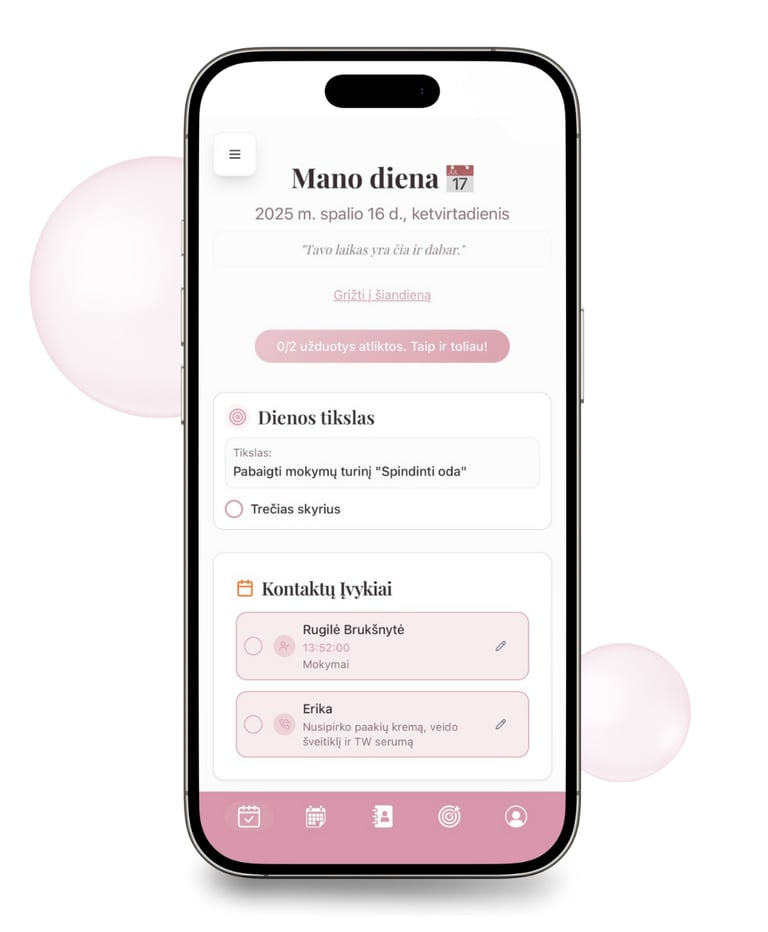 Tai tinka bet kuriai moteriai vystančiai savo vieklą — su klientų baze, užduotimis, susitikimais ir tikslų sistema.